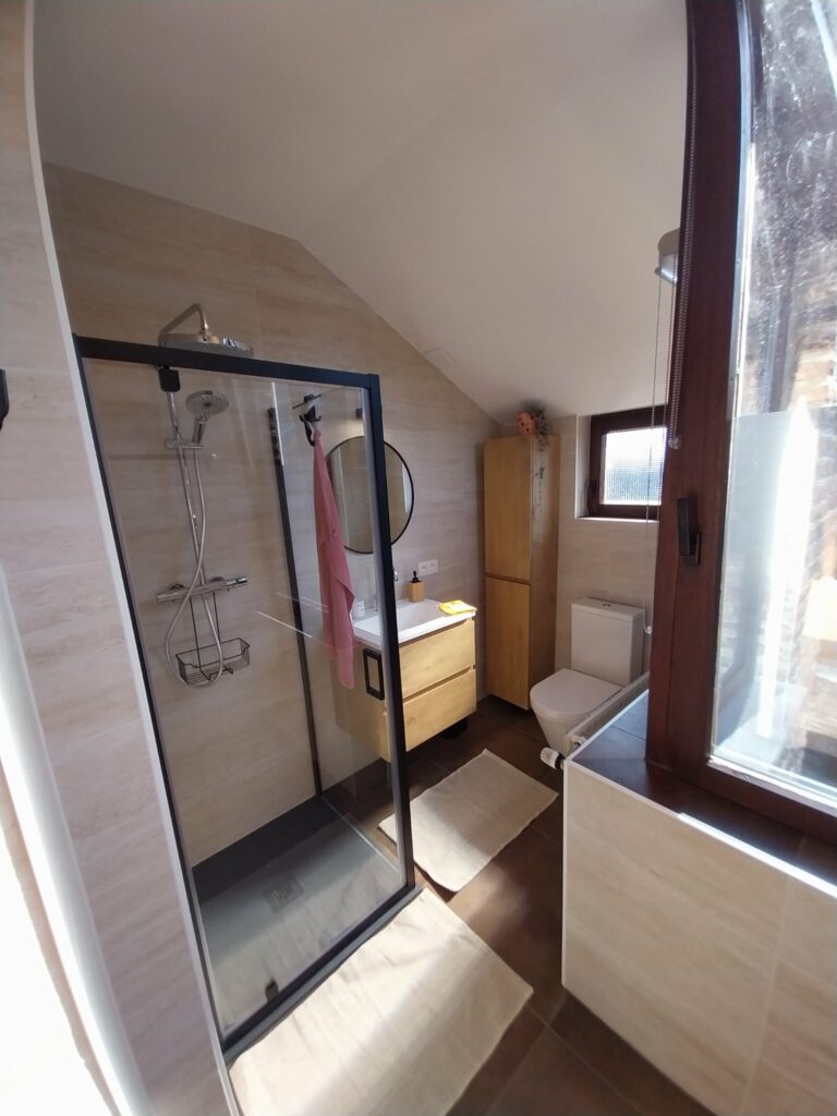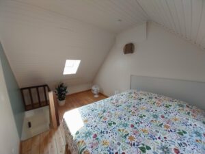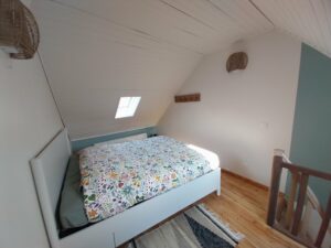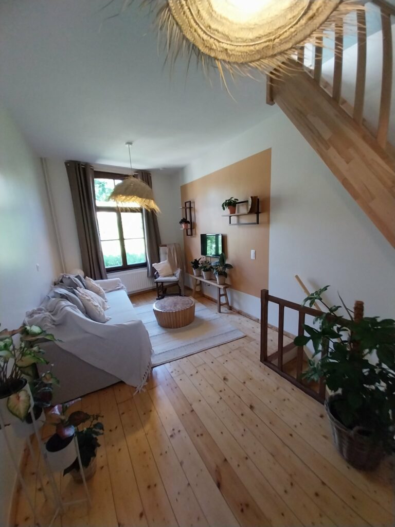 Au premier étage, vous découvrirez un salon cocoon équipé d’un canapé convertible pouvant accueillir 4 personnes. Nous avons également placé un rockingchair et une TV. La salle de bain est équipée d’une douche, un lavabo et une toilette. Un sèche cheveux est à votre disposition.